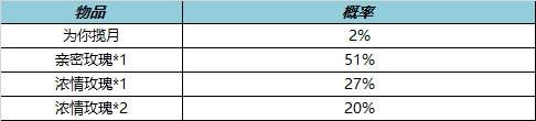 购买红蓝对决(1日),可额外随机获得以下之一:为你揽月*1、亲密玫瑰*1、浓情玫瑰*1、浓情玫瑰*2。累计20次至少可获得为你揽月*1。