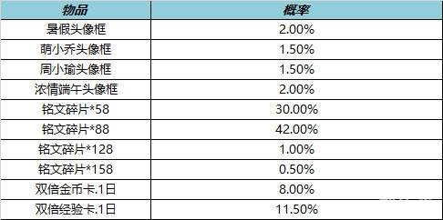 打开后可随机获得以下奖励之一:暑假头像框、萌小乔头像框、周小瑜头像框、浓情端午头像框、双倍金币卡:1日、双倍经验卡:1日、铭文碎片*158/128/88/58。
