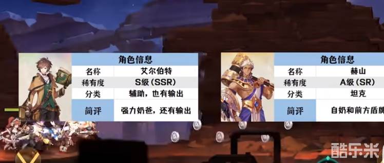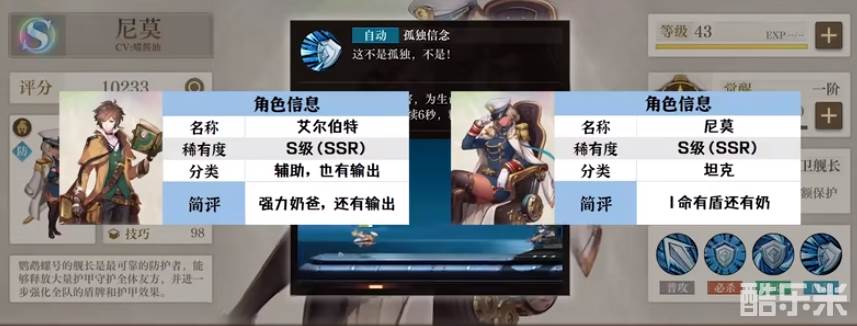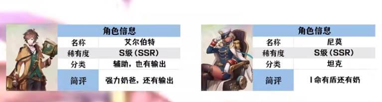 1.首先看下角色信息,分别是艾尔伯特S级(SSR),辅助类型,也有输出,强力奶爸;尼莫稀有度S级(SSR)分类为坦克,I命还有盾还有奶