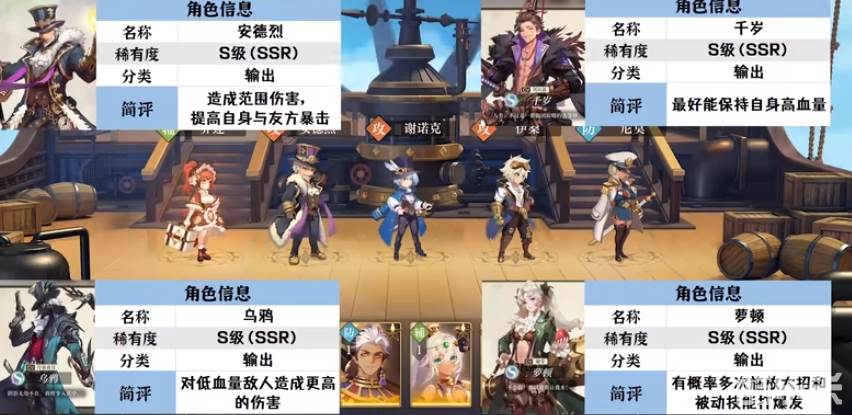2.谢诺克,稀有度A级(SR),输出类型,偷攻击力,针对高攻输出(和乔莲一起);乔莲A级(SR),辅助类型,辅助增伤,输出,还有单奶(和谢诺克一起)