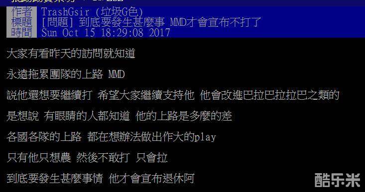 经常看台湾网友系列的朋友应该都知道MMD,几乎什么事都能拿来和MMD比较,而在昨日世界赛LMS赛区所有战队都确定被淘汰后,台湾网友发布了各种话题,其中有一篇便是讨论“到底要发生甚么事,MMD才会宣布不打了”。