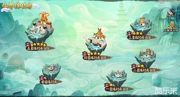 练功房共分为6个房间,分别为:普通练功房、一星练功房、两星练功房、三星练功房、四星练功房、五星练功房