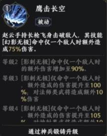 1. 鹰击长空[被动]:赵云手持长枪飞身击破敌人,其技能[幻影无极]命中仅一个敌人时额外造成75%伤害;