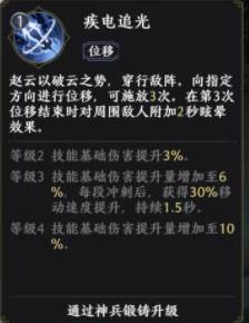 2. 疾电追光:[位移]赵云以破云之势,穿行敌阵。向指定方向进行位移,可施放3次。在第3次位移结束时对周围敌人附加2秒眩晕效果。;
