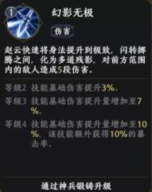 3. 幻影无极[伤害):赵云快速法提升到极致,闪转挪腾之间,化为多道残影,对前方范围内的敌人造成5段伤害;