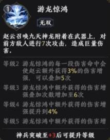 4. 游龙鸿[无双)赵云召唤九天神龙附着在武器上,对前方敌人进行7次攻击,造成巨量伤害。