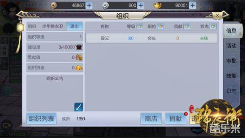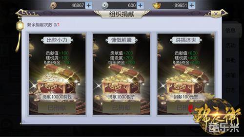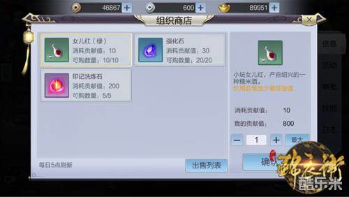 玩家们可以通过组织任务和捐献等方式获得组织的贡献值,在组织的专属商店中购买女儿红、强化石和印记洗练石等特殊的道具。