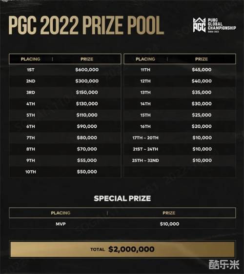 PGC2022的总奖金为200万美元,将根据比赛的最终结果分配给参赛队伍。第一名冠军队伍将拿到60万美元奖金;第二名亚军队伍则是拿到一半30万美元奖金;第三名季军队伍拿到15万美元奖金。此外还额外设置了MVP奖金:获得PGC 2022 MVP称号的选手将获得1万美元的奖金!