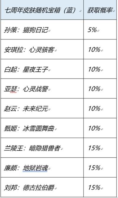 6、打开红/蓝史诗皮肤宝箱可随机获得史诗皮肤一个,具体的皮肤名单可以参考文章图示。