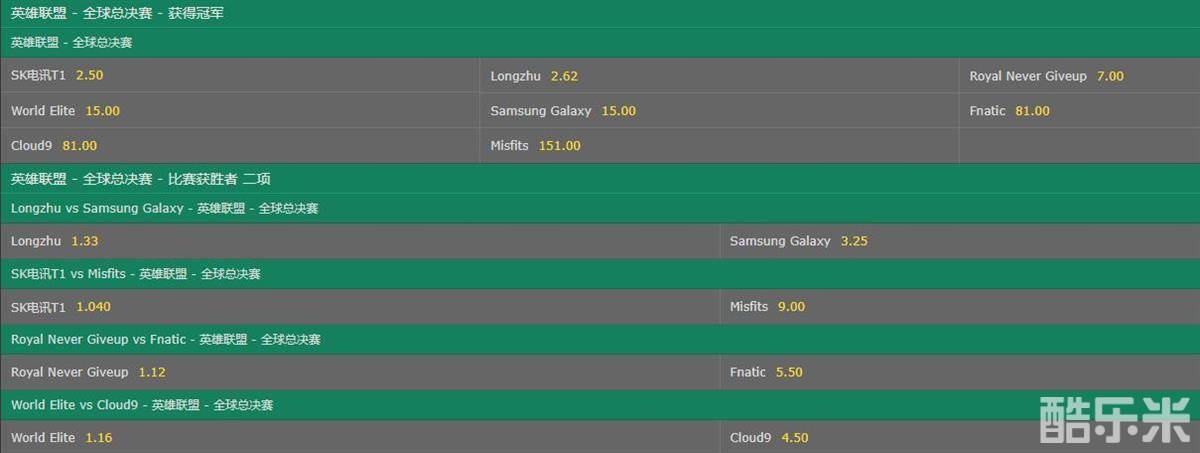 至于RNG和FNC战队的比赛,两者赔率差距也比较明显,毕竟RNG战队在小组赛中打出相当出色的表现,Uzi现在势不可挡,FNC战队的上路短板非常容易成为突破口,因此RNG战队取胜也是非常大机率的事情。而WE战队要对阵的C9战队有可能是欧美队伍中实力最强的一支,所以赔率也表示了他们对这支队伍的期盼,但由于C9战队在小组赛第二轮只赢了一次,全靠SKT战队比分领先才获胜,所以也很难相信他们可以在八强赛走得更远。