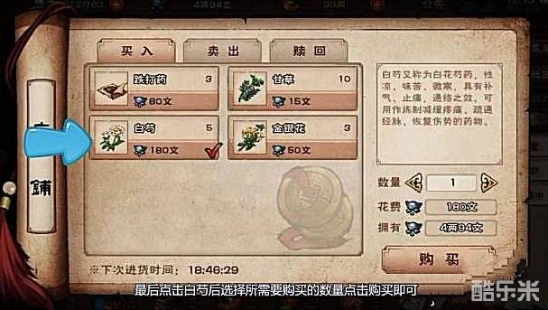 除此之外,玩家在南阳渡药铺可以购买白芍,一天可以购买5个,南阳渡药铺白芍价格为180文钱一个。