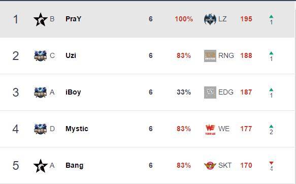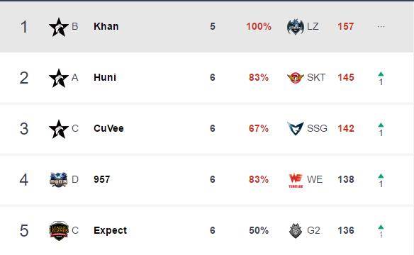 Khan、Cuzz、Bdd、PraY和Meiko分列各位置榜首;