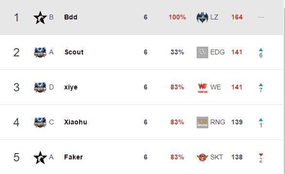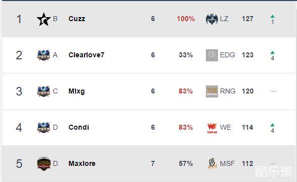 Condi、xiaohu、Ming排名第4,LPL上单位仅957一人入选前五。