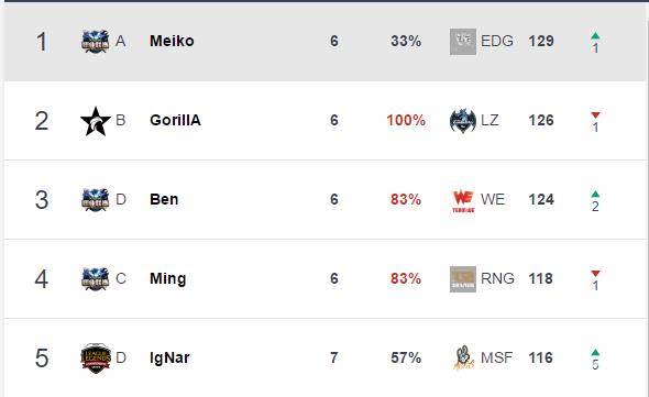 小组赛全部结束后,知名国外数据网站Best.GG更新选手排名——