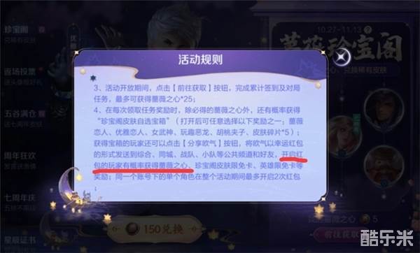 第二个是,每次在领取任务中的蔷薇之心时,都有机会获得“珍宝阁皮肤自选宝箱”,而活动宝箱的玩家,在点击分享欧气之后,会将欧气以红包的形式发送出去,而开启红包的玩家,则有可能获得蔷薇之心,每个玩家在活动期间,最多只能开启两次红包。而在红包中,只有5%的概率获得两个蔷薇之心,其他都是皮肤体验卡,所以在红包中,我们最多可以获得4个蔷薇之心。