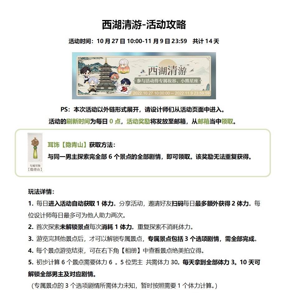 活动概要:活动期间进入活动页面,即可开启和他的西湖之旅。和他游览西湖景点后,还有专属妆容奖励耳饰、小熊星座等神秘惊喜放送!