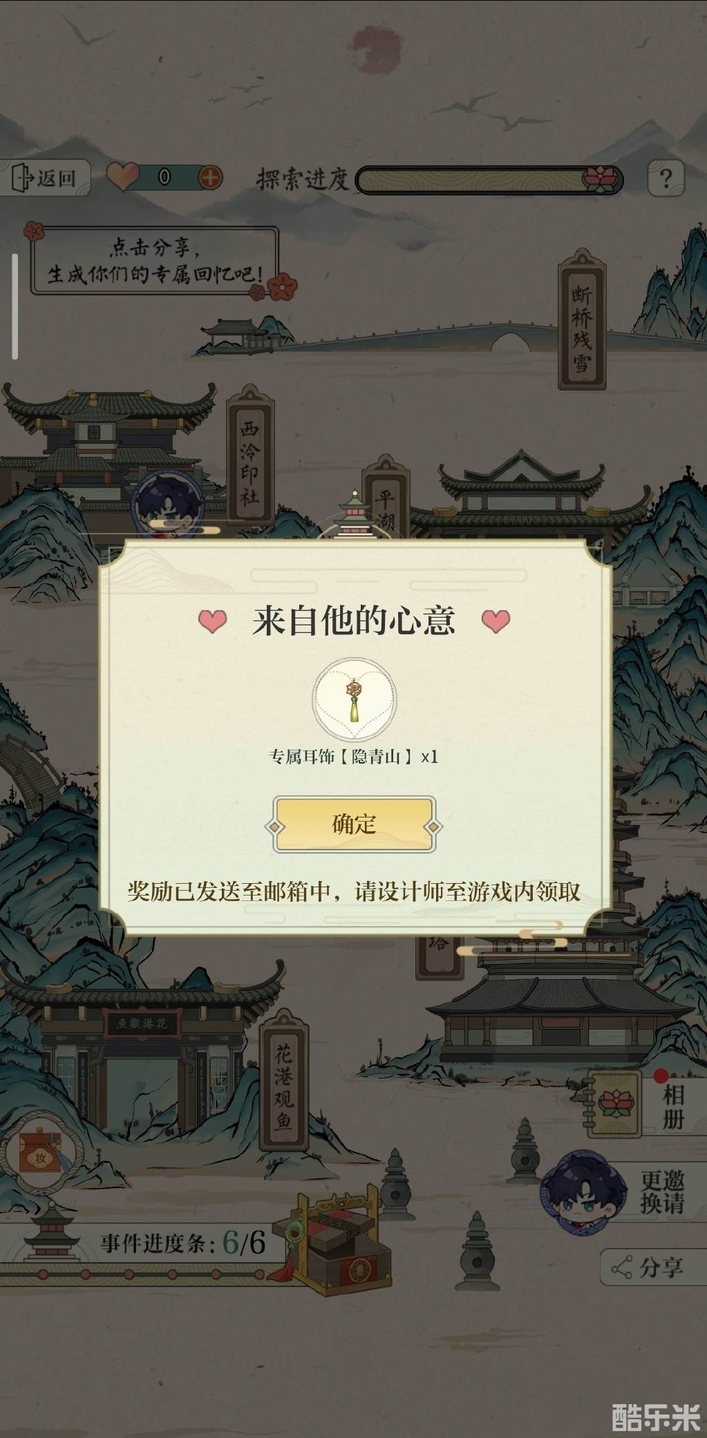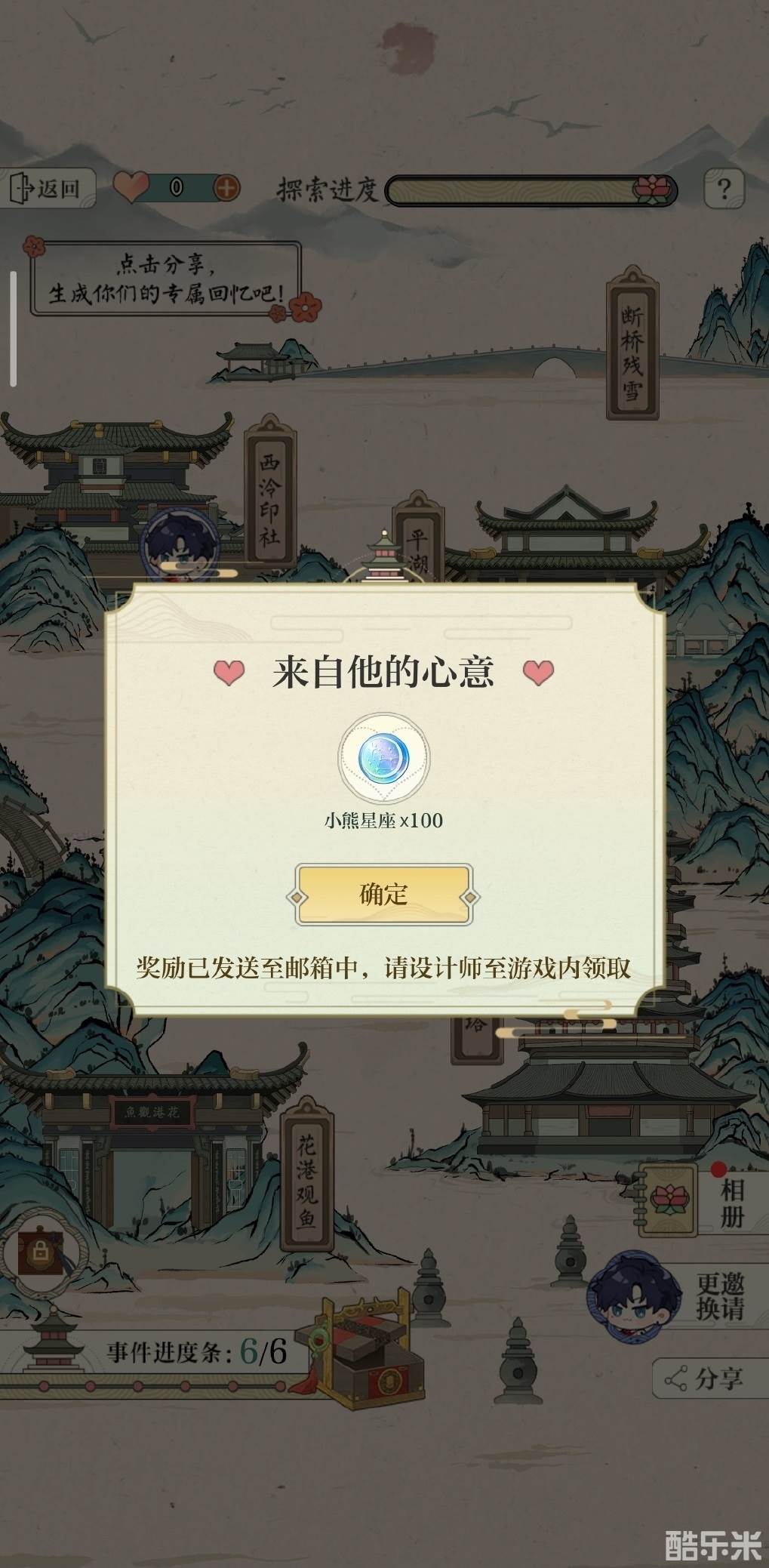 1、选择男主→选择地点→每日一次机会+扫码两次→和男主同游获取剧情→每个地方可以获得10小熊,五个男主总计300小熊→一个男主六个地点全部开完可获得100小熊和饰品【隐青山】。