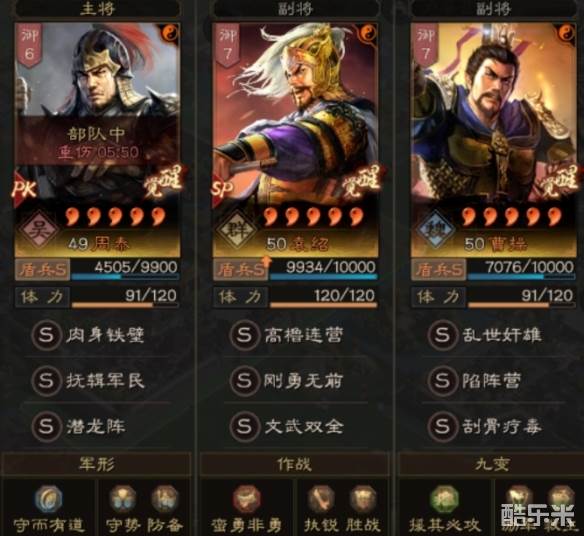 2)【曹操+潜龙】曹操和潜龙是绝配!在潜龙阵副将特性影响下,曹操自带战法里的恢复目标不再是自己,而会改成锁定周泰,SP袁绍稳定的伤害能源源不断给周泰提升治疗,让主位变得不再危机重重。