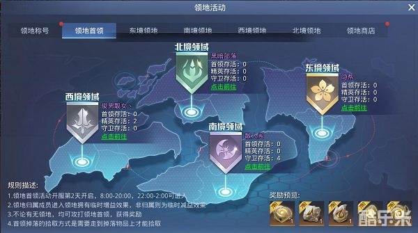 1.领地首领活动在开服第2天开启,开启时间为8:00-20:00,22:00-2:00可进入!领地分为4个,每个公会只能战力其中一个!