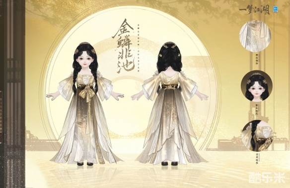 忆仙姿系列第二套时装·金鳞非池以传说中专司凡人气运,指点机遇财源的金鳞仙官为原型参考,在民俗底蕴中加以创新设计,锦鲤与金叶子的元素搭配黑、白、金三色,十分华贵大气。