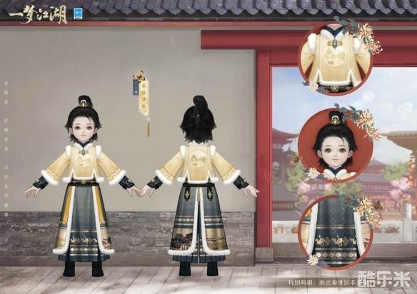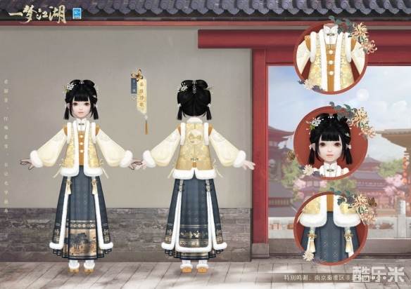 浅金色琵琶袖搭配绣满金色梅花的短款马甲,衬得小女侠好似一位正准备出游赏梅的千金小姐。墨色长裙下是一双围镶皮草的暖黄色小鞋,冬日出游就是从头到脚都要保暖又亮眼。