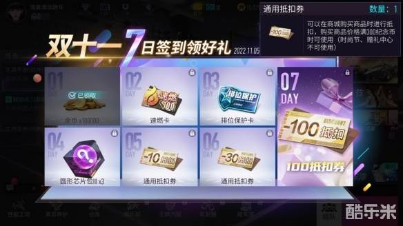 从11月5日开始,车手们每日参与双十一签到活动就可以获得三张不同档位的通用抵扣券,车手们可以在商城购买商品并达到一定价格时进行抵扣(时尚节与赠礼中心不可使用),心动好物无需纠结,全部都能轻松带回家啦!