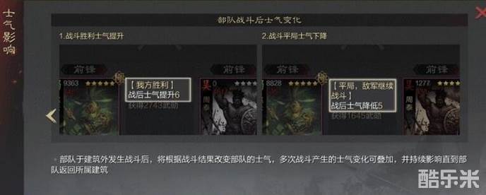 除先前蓝贴中提到的行军距离、补给范围等战略因素可对士气造成影响以外,处于建筑外的部队也将根据战斗结果改变部队士气:若战胜强敌,则部队士气会提升;而若陷入苦战,则部队士气也会下降,士气改变将持续影响直到部队返回所属建筑。部队士气的高低最终将在战斗中影响武将战法发动率与生效几率。
