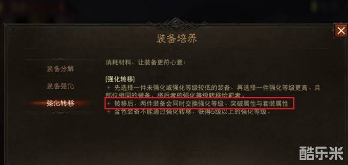 1、装备觉醒是不能继承的,玩家在铁匠处进行装备强化转移后,两件装备只会交换强化等级、突破属性与套装属性,不会继承觉醒。