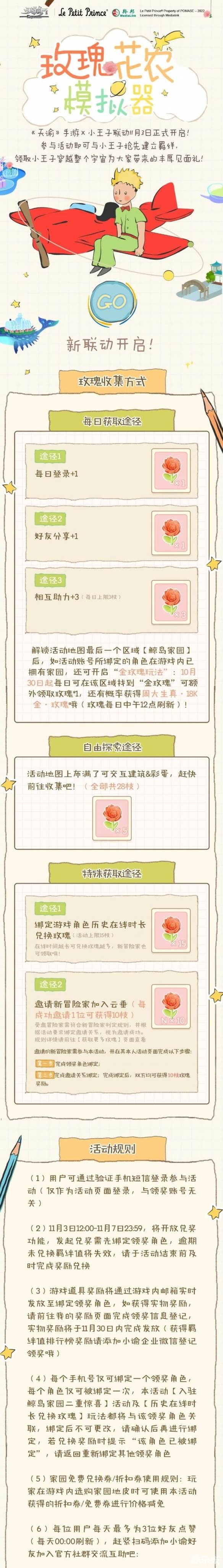 帮助小王子收集玫瑰,即有机会获得万元现金红包、野兽派·佩醺玫瑰香水、永久全套联动外观、全新限量周边礼盒等好礼。