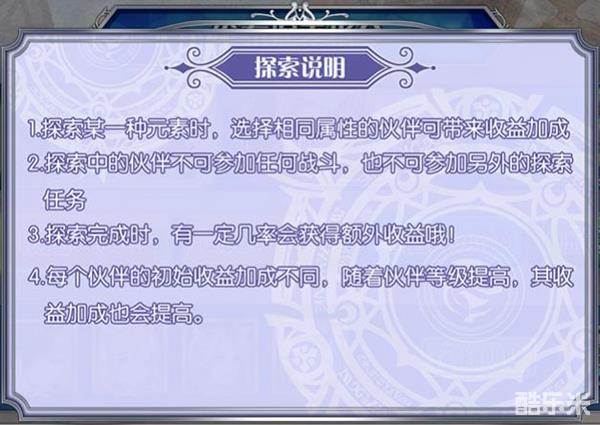 探索玩法中,需要注意的是,探索任务分为:风、火、水、光、暗五种不同的魔卡属性,举例说明:如选择的小伙伴儿同为风属性,那么将会大大增加风属性探索任务收益的百分比;