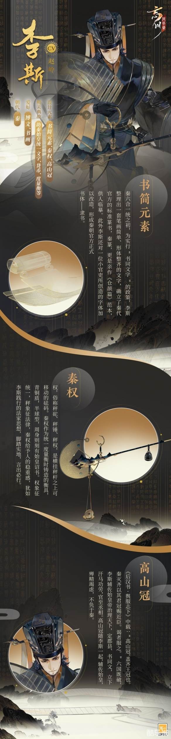 认识完于谦后,再来看看第二位新名士的介绍吧~李斯,楚国上蔡人,他跟随荀子学习,并将所学发挥得淋漓尽致,立下汗马功劳,官至丞相。