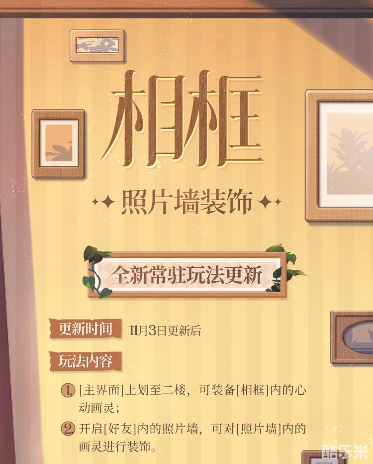 本周更新后,[主界面]二楼-[相框]新增照片墙装饰玩法。可在[相框]中装备横屏和竖屏画灵各一张,并同步在[命运小屋]内生效。在[命运小屋]中购买的所有[画框]类型道具,都将悬挂展示对应同方向的画灵。