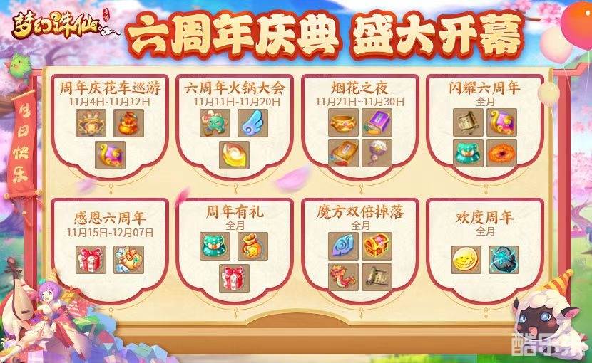 从装备宿灵到火锅大会;从花车游行到烟花之夜;更有周年好礼,多重活动伴你欢度周年。六周年庆典狂欢好生精彩,不如就让兜妹先为各位少侠逐一介绍,小做预热吧!