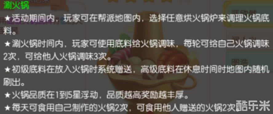 2022年11月11日-2022年11月20日期间,帮会内将开启一场美味的火锅盛宴,少侠们不仅能亲手制作美味佳肴,更能获取包含皮皮龙灵器碎片、高级羽化翎、天元石在内的多种福利道具!