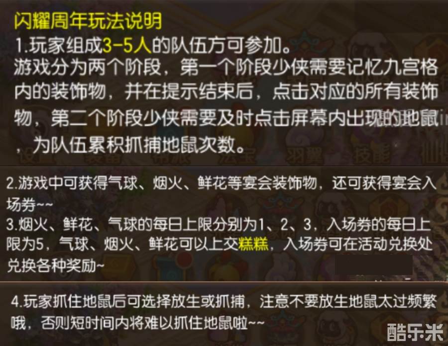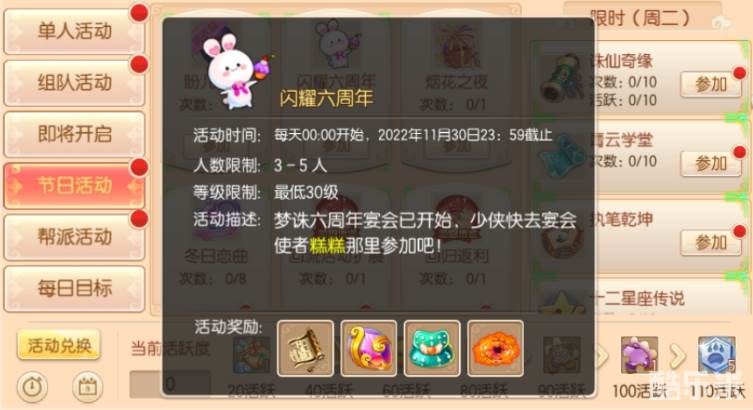 2022年11月1日-2022年11月30日期间,少侠们组成3-5人小队结伴参加宴会并击败前来捣乱的地鼠恶霸即可获得烟火、鲜花、气球,将此三种装饰品上交糕糕即可获取宴会入场券。