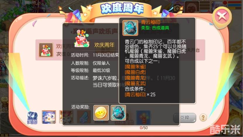 通关【欢庆周年】副本即可获取青云秘印,消耗25个青云秘印即可合成【魔兽朱雀】、【魔兽白虎】、【魔兽青龙】、【魔兽玄武】其中之一!强大的魔宠谁不想要,心动不如行动,少侠们抓紧时间了~