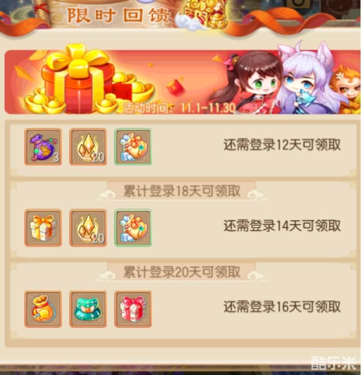 2022年11月1日-2022年11月30日期间,累积登录即可领取多重好礼,少侠们每天登陆都能解锁全新一天的福利礼包,每天上新动力up↑