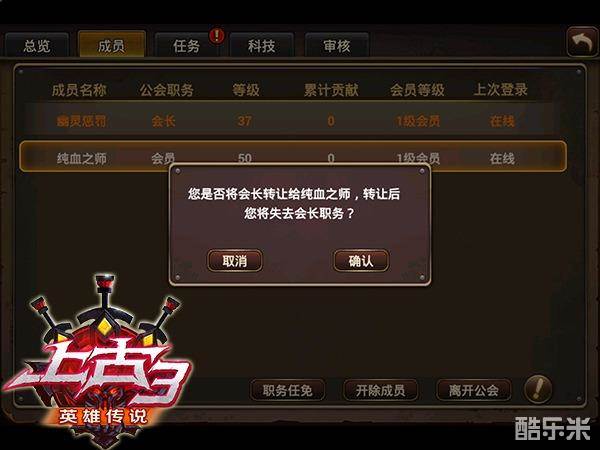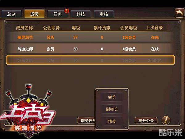 公会里存在的职位说明:会长(1名)--可以修改公告,任命公会职务,开除成员,升级公会等级,激活公会科技,指派公会战成员,批准入会申请。