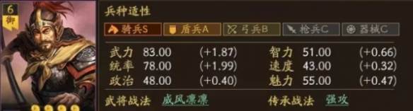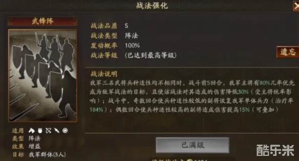 武锋阵是这套阵容里的核心战法。其一能减伤,前五回合,使我军主将有80%的概率成为敌军战法目标,并减伤30%;其二能治疗,奇数回合使兵种属性最低的武将恢复单体兵力184%;最后能增伤,提高兵种适应性最高武将造成伤害15%,并且可以叠加。显而易见,这个战法适合拖回合、打中后期。