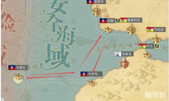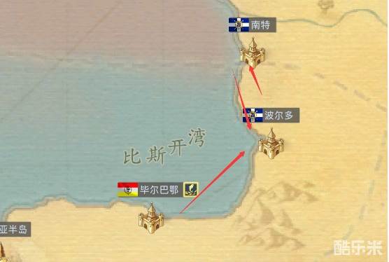 毕尔巴鄂——波尔多——南特,毕尔巴鄂的羊毛卖到波尔多,波尔多的葡萄醋卖到南特,南特的牛肉卖到波尔多,在这3个地方往返。在这3个港口附近可以迁一个自建港口,让商队中的成员都建交,可以快速拖航到附近,从而节省时间。