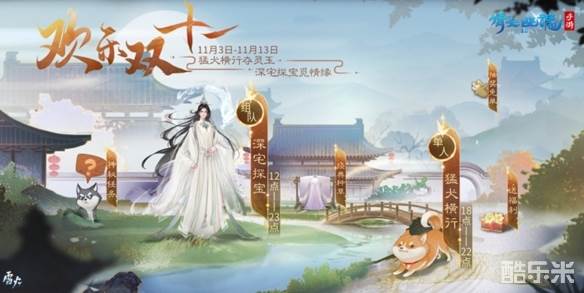 欢乐双十一活动期间18:00-22:00,【猛犬横行】玩法开放,等级≥50级即可单人参与!躲避横冲直撞的猛犬,巧夺暗藏着富饶的灵玉宝箱!四名玩家相竞夺取灵玉宝箱,在单局玩法3分钟内,开启最多宝箱并返回出生地的玩家将赢得胜利,获得丰厚奖励!