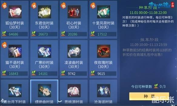 11月1日-11月8日,全服开启经典时装种草投票!每位玩家每日有3次种草投票机会,完成神秘任务时每天会有额外的种草次数!截至11月8日22时,种草数前5名的时装将于11月9日10:00-11月13日以8折的折扣价在商城礼包中返场出售!