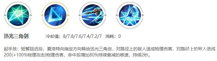 起手技:短暂延迟后,夏洛特向指定方向释放迅光三角剑,对路径上的敌人造成物理伤害,对路径上的敌人造成200(+100%物理攻击)物理伤害,命中后增加80%持续衰减的移速,持续2秒。