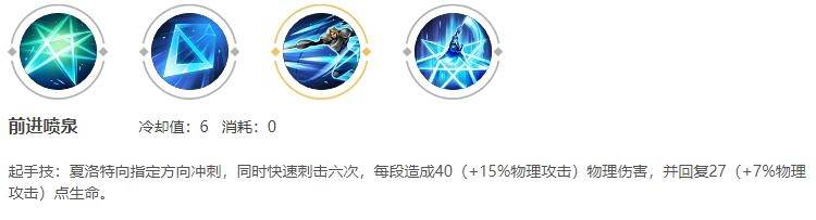 起手技:夏洛特向指定方向冲刺,同时快速刺击六次,每段造成40(+15%物理攻击)物理伤害,并回复27(+7%物理攻击)点生命。