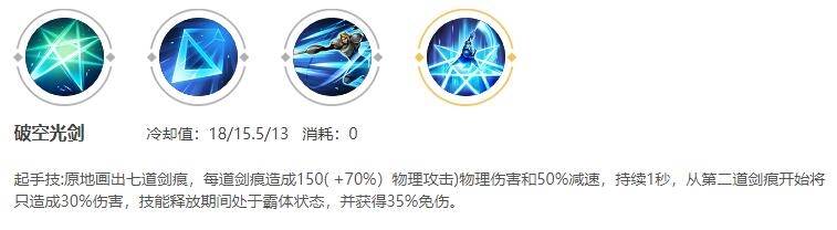 起手技:原地画出七道剑痕,每道剑痕造成150( +70%)物理攻击)物理伤害和50%减速,持续1秒,从第二道剑痕开始将只造成30%伤害,技能释放期间处于霸体状态,并获得35%免伤。