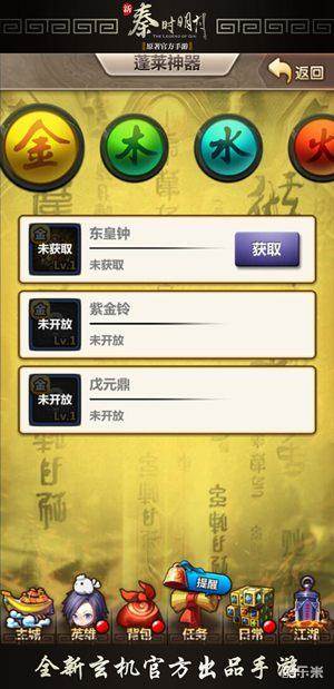 这就是我们点进去以后会首先看到的主界面了,分为金木水火土五个选项。里面每个神器的属性和所适合的角色类似都有不同,当我们点进去以后看的界面是这样的。
