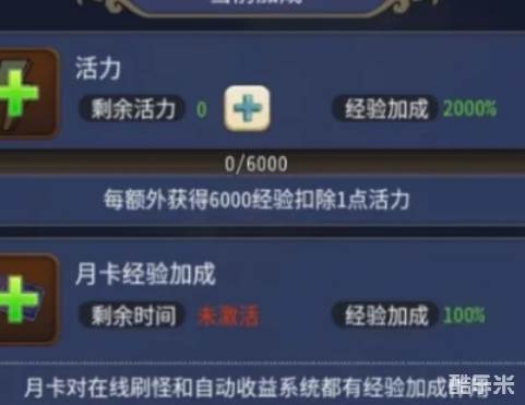 55月卡V1贵族:每日在线挂机经验是有限额的,在左上角打卡页面的地步可以查看额度,建议时间水晶每天买满,通过挂机把限额挂满,离线经验水晶也要吃满,28级之后记得要加入家族,在家族页面进入酒馆每天都是可以吃经验了,发现很多新人都不知道,主线必须做满基本就能跟上第一梯队了,至于如何成为等级金字塔顶的男人,可以找一下我们巨蟹5克总在贴吧发的新区冲级攻略。