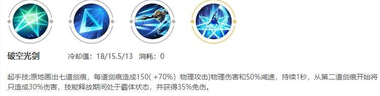 起手技:原地画出七道剑痕,每道剑痕造成150( +70%)物理攻击)物理伤害和50%减速,持续1秒,从第二道剑痕开始将只造成30%伤害,技能释放期间处于霸体状态,并获得35%免伤。