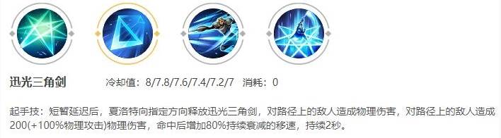 起手技:短暂延迟后,夏洛特向指定方向释放迅光三角剑,对路径上的敌人造成物理伤害,对路径上的敌人造成200(+100%物理攻击)物理伤害,命中后增加80%持续衰减的移速,持续2秒。