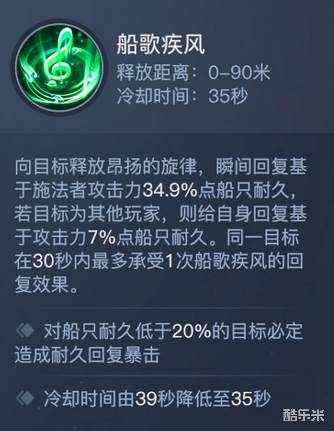 2技能船歌低语是群体治疗技能,提升回复减少冷却,推荐升满。